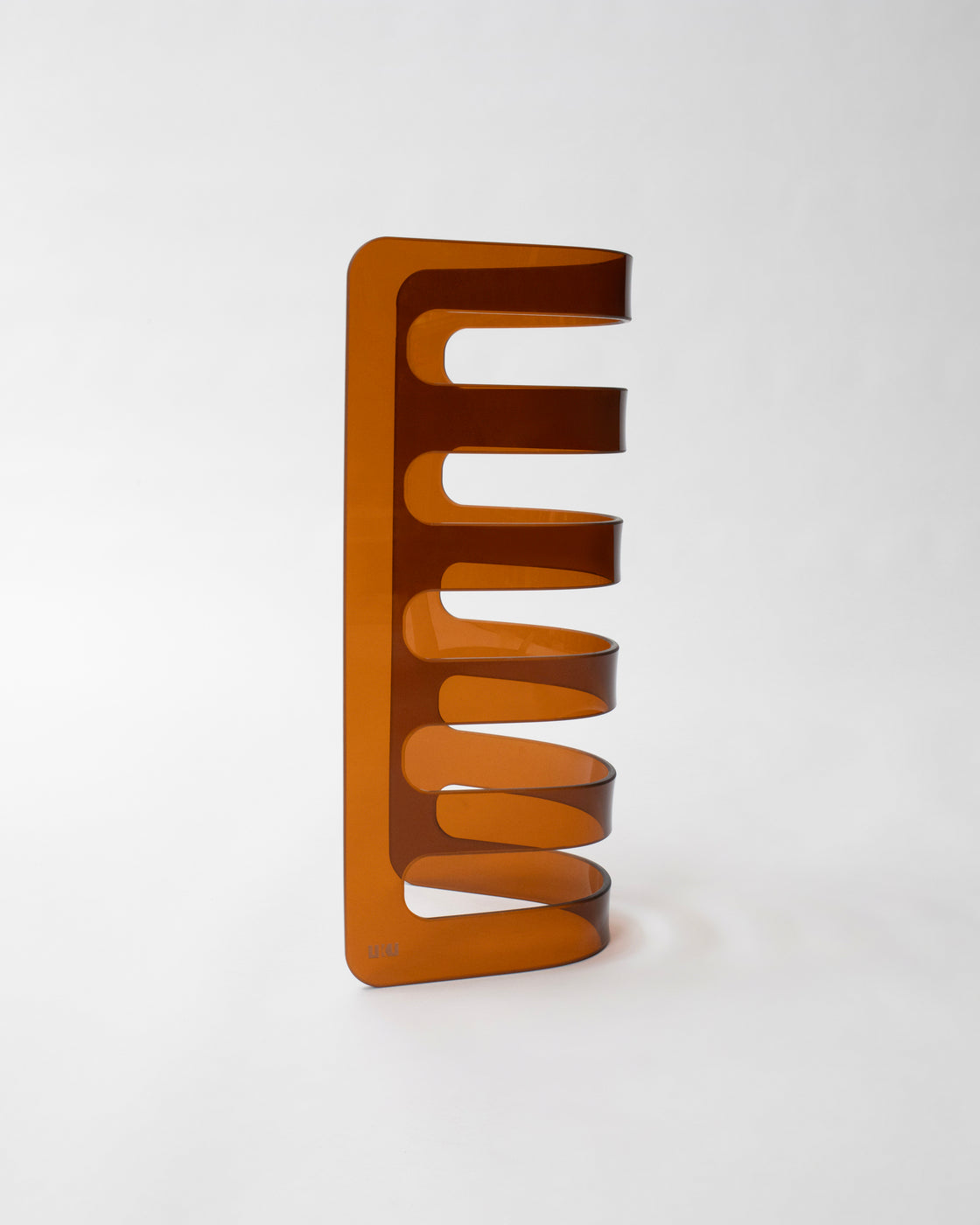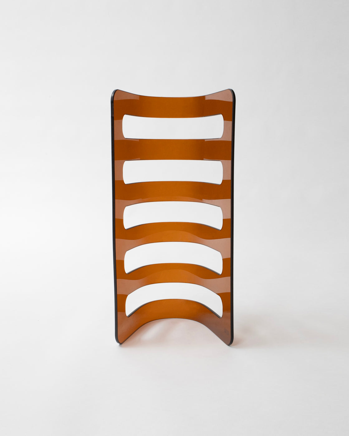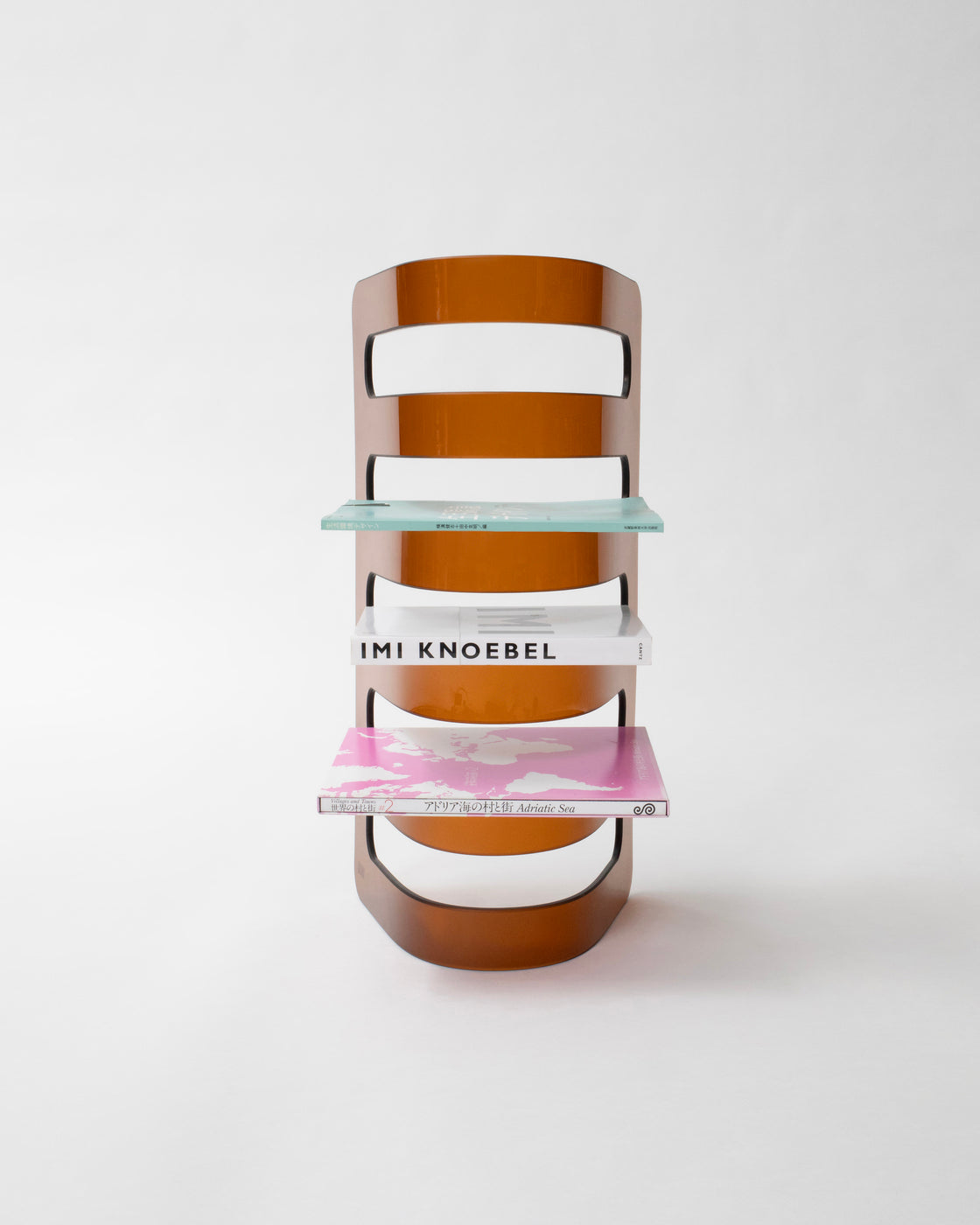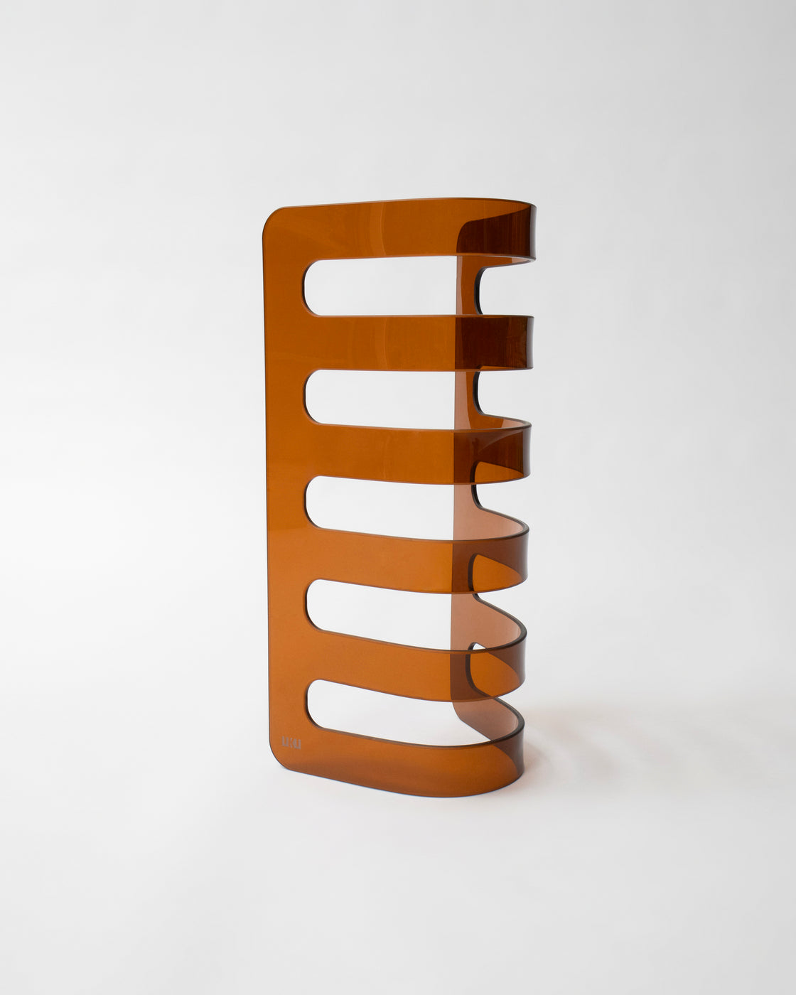 Transparent book stand with a sculptural appearance. Multiple levels for placing books or magazines are created from a single continuous form. Minimalist, sturdy, and surprisingly light. The books appear to float, while the stand itself functions as a clear frame.