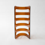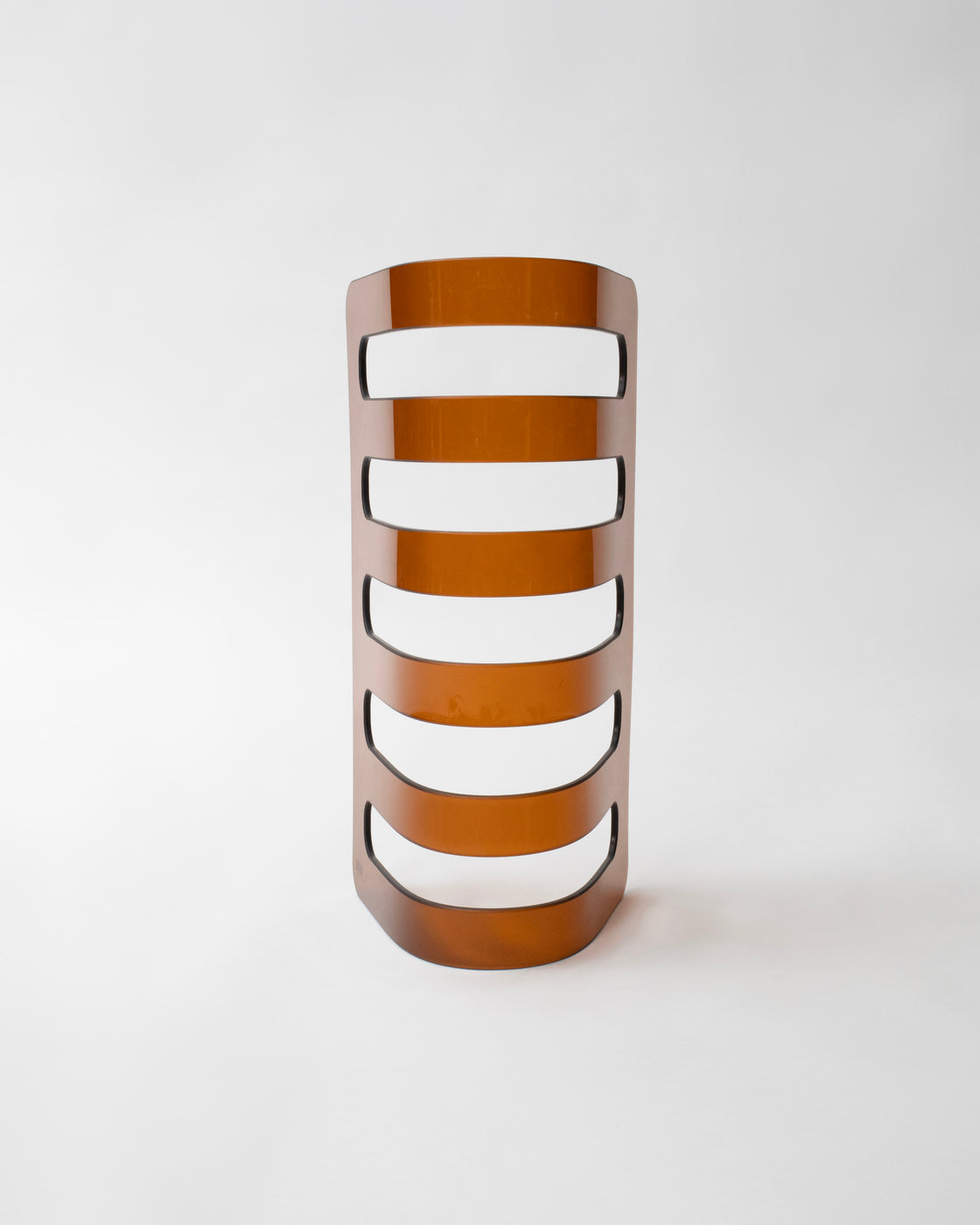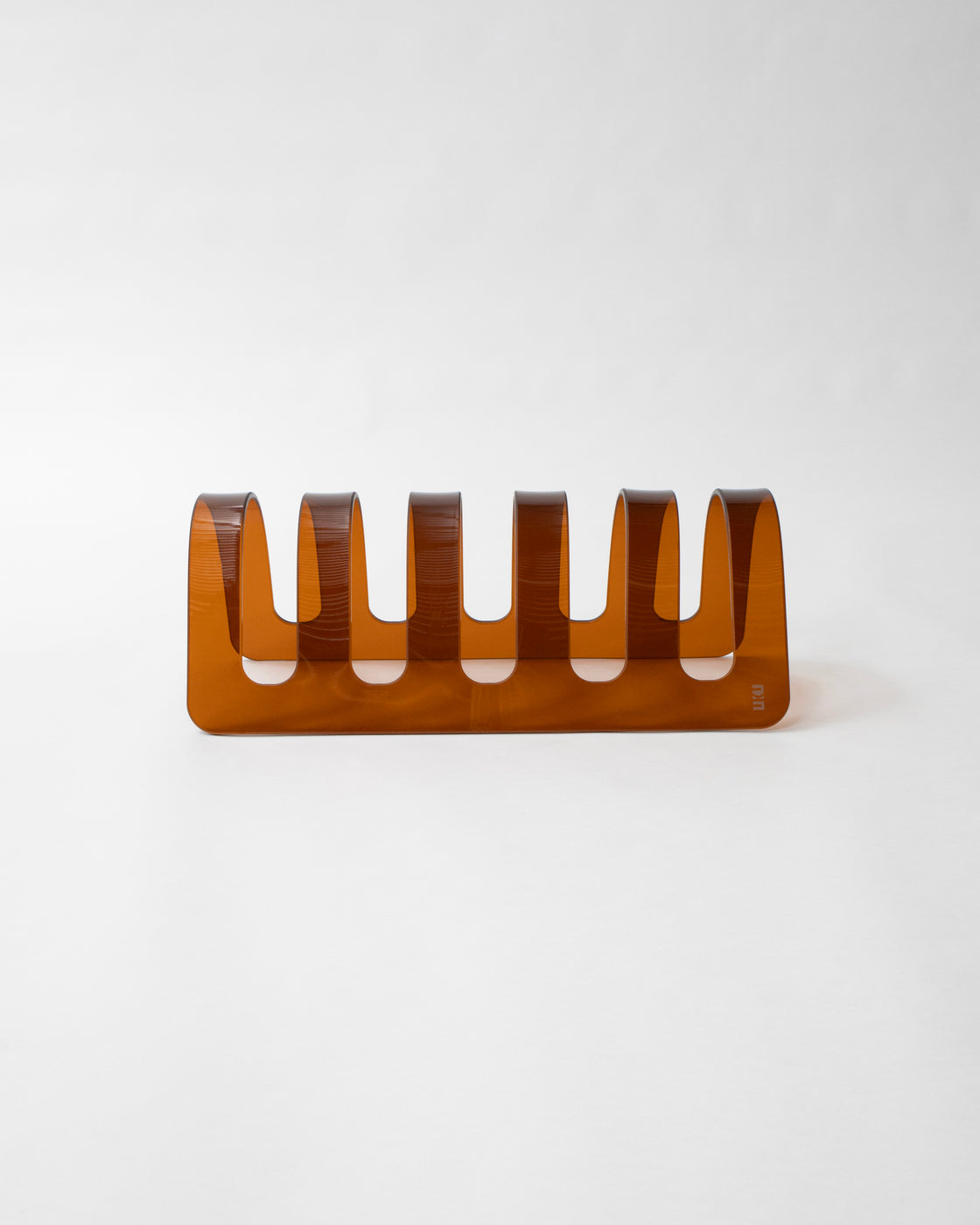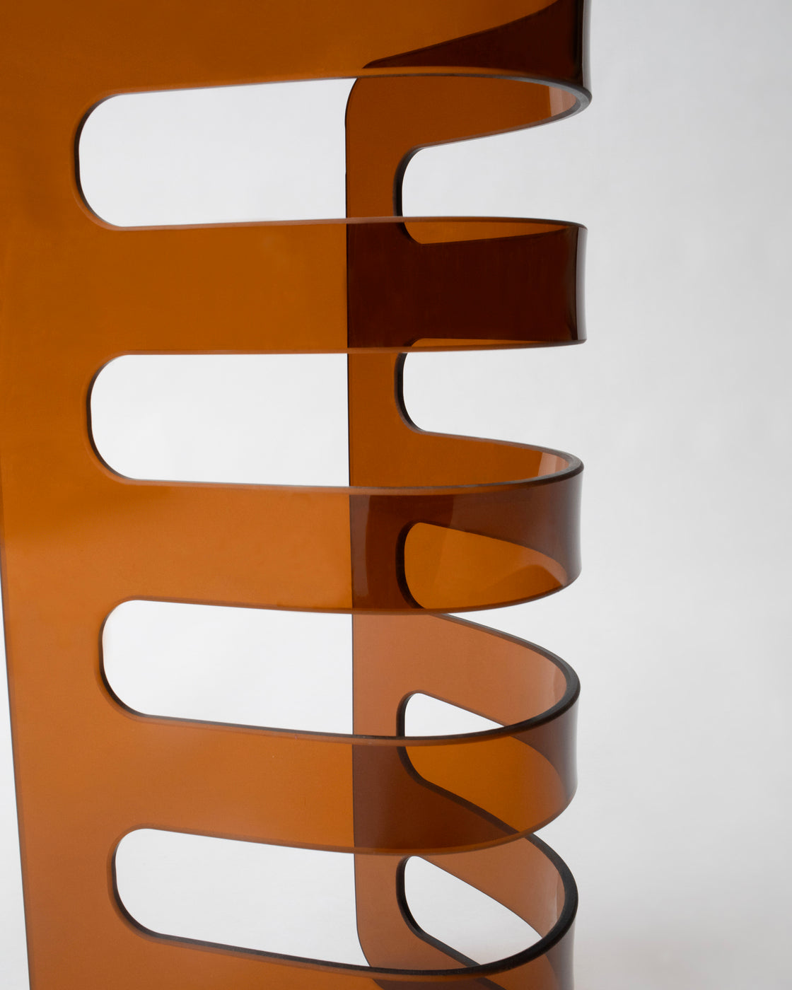 Transparent book stand with a sculptural appearance. Multiple levels for placing books or magazines are created from a single continuous form. Minimalist, sturdy, and surprisingly light. The books appear to float, while the stand itself functions as a clear frame.