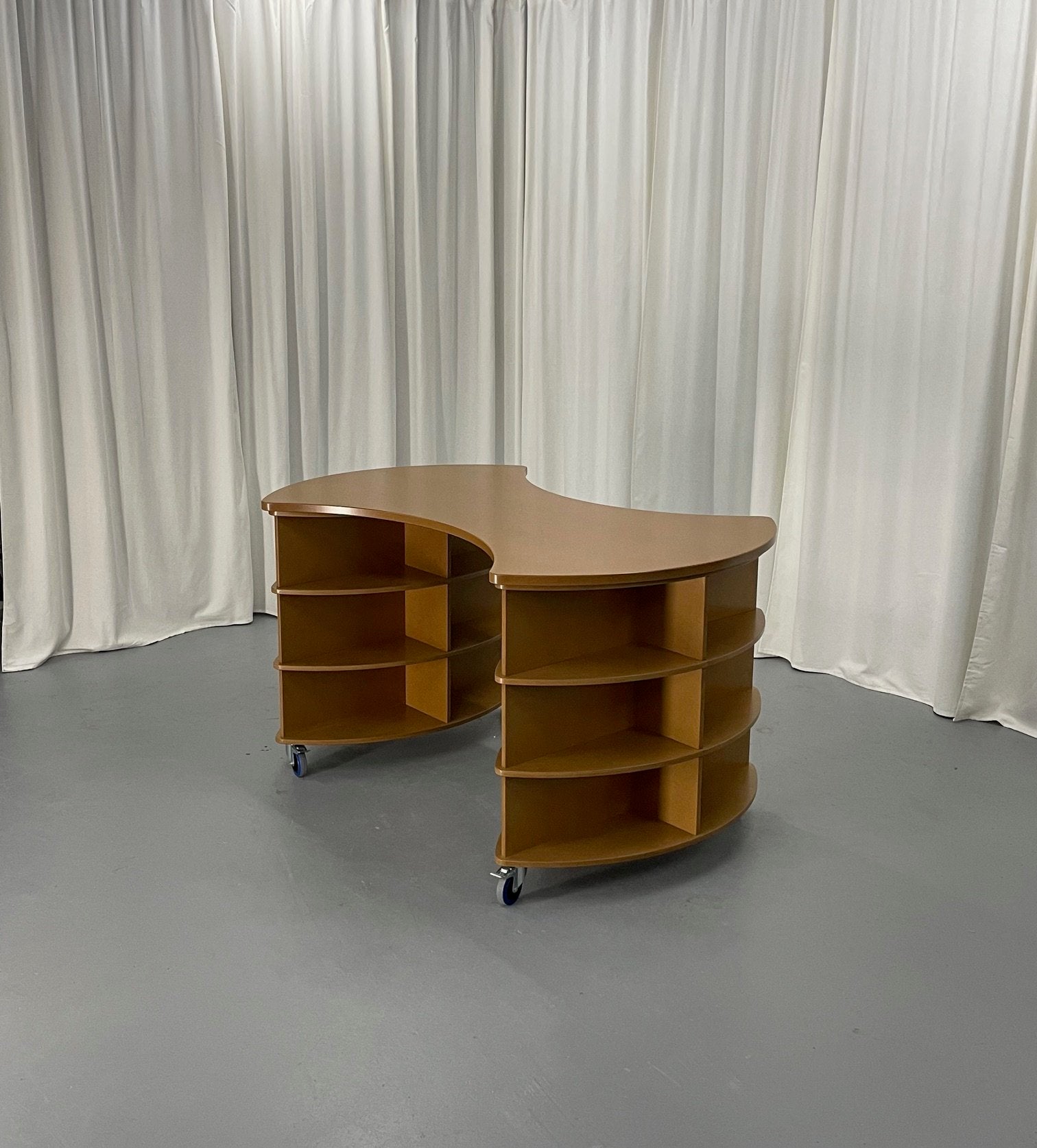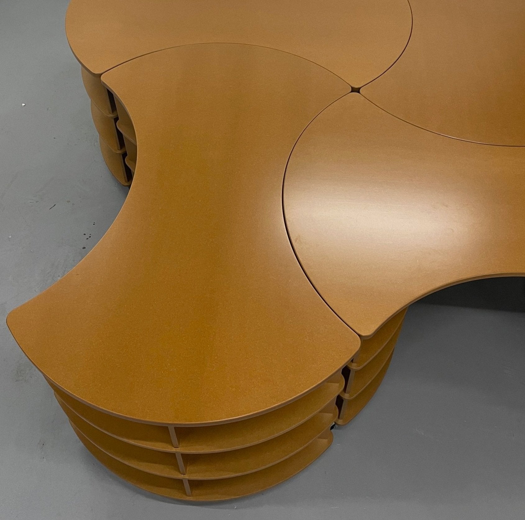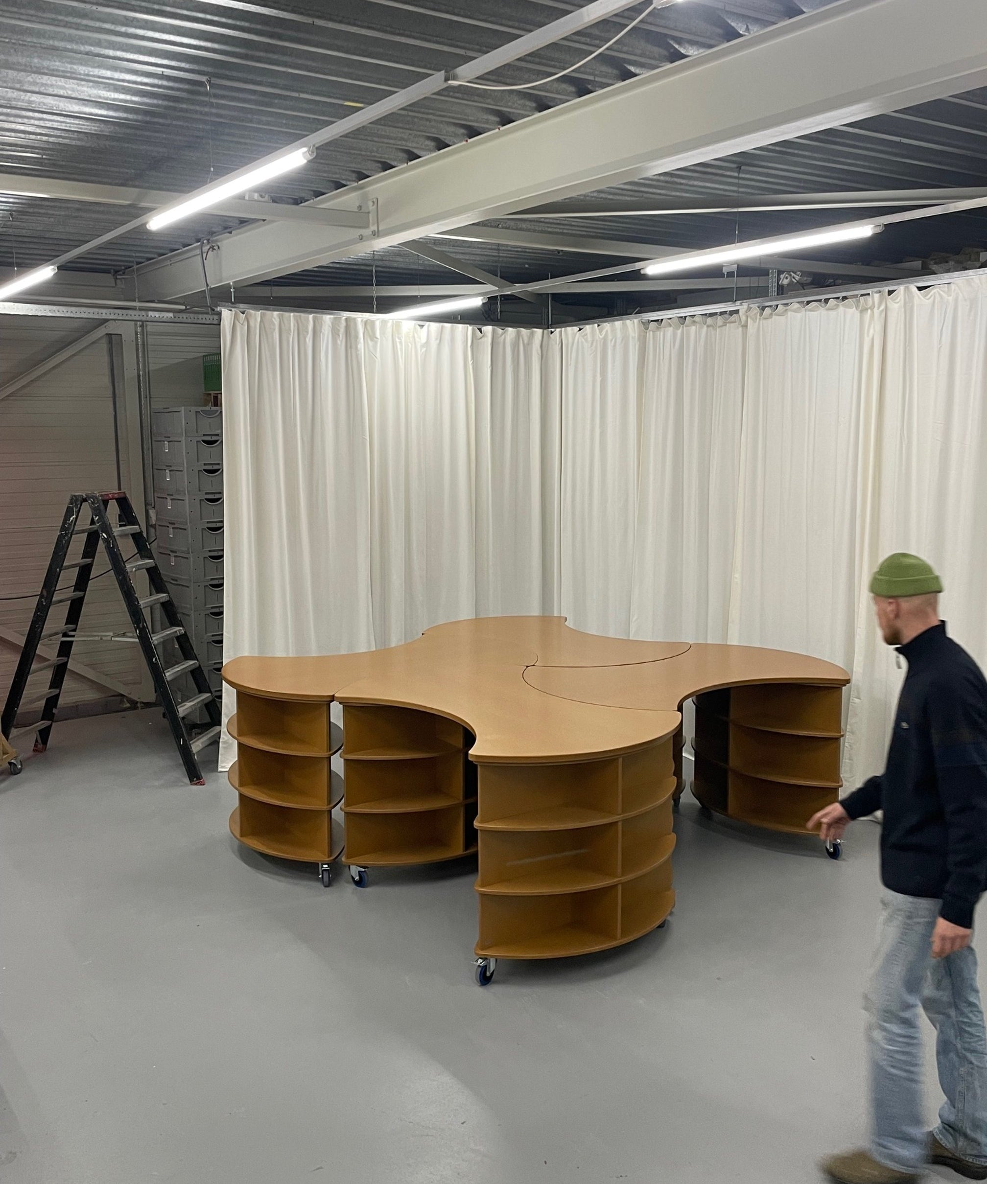 For a London pop-up in collaboration with Birkenstock, Gowtu Agency asked us to design worktables for workshops, talks, and meetings. The result: four tables that can be combined to form one large table. The tabletops are shaped after the tread pattern of Birkenstock soles. The legs are fitted with wheels for mobility and double as built-in storage.