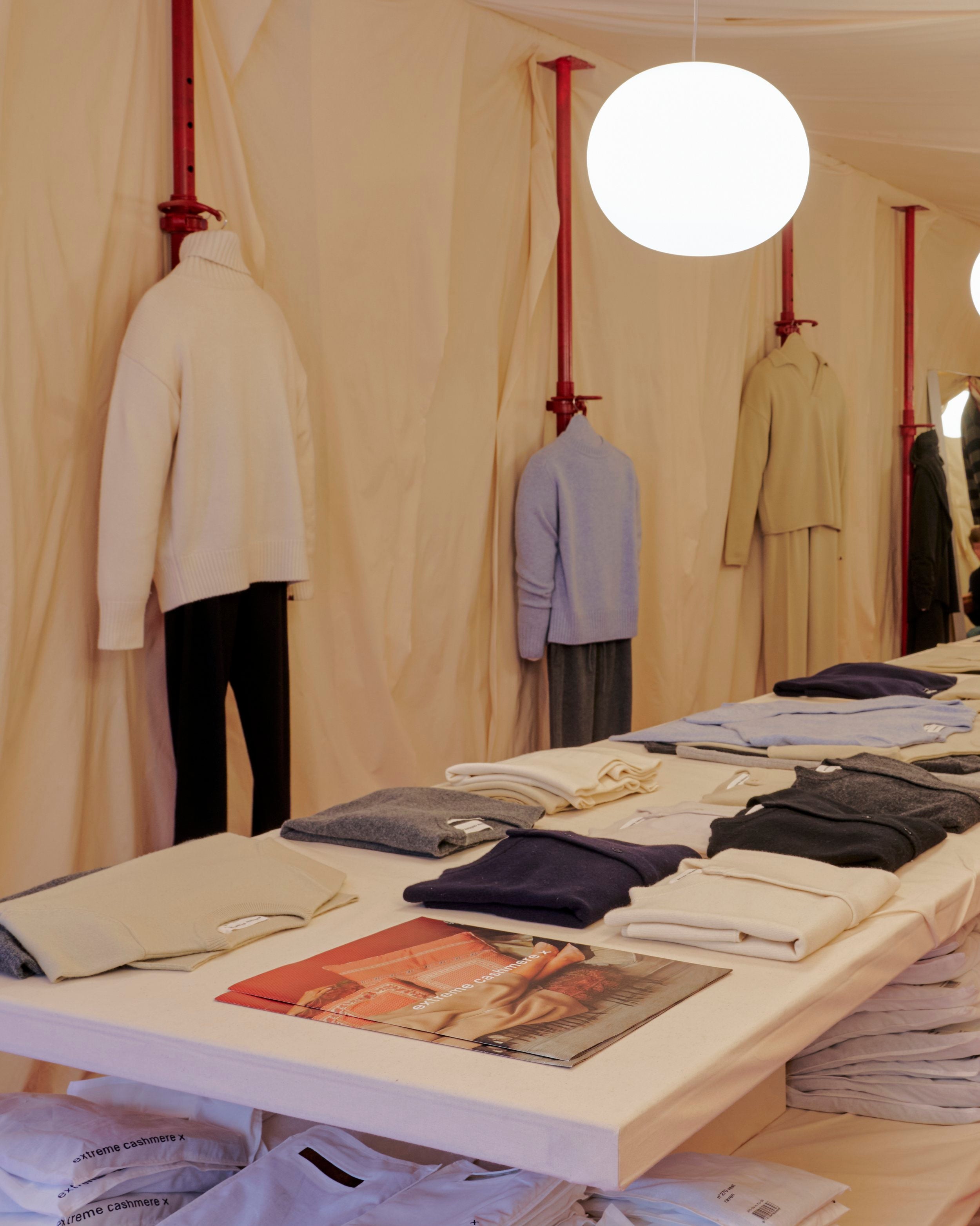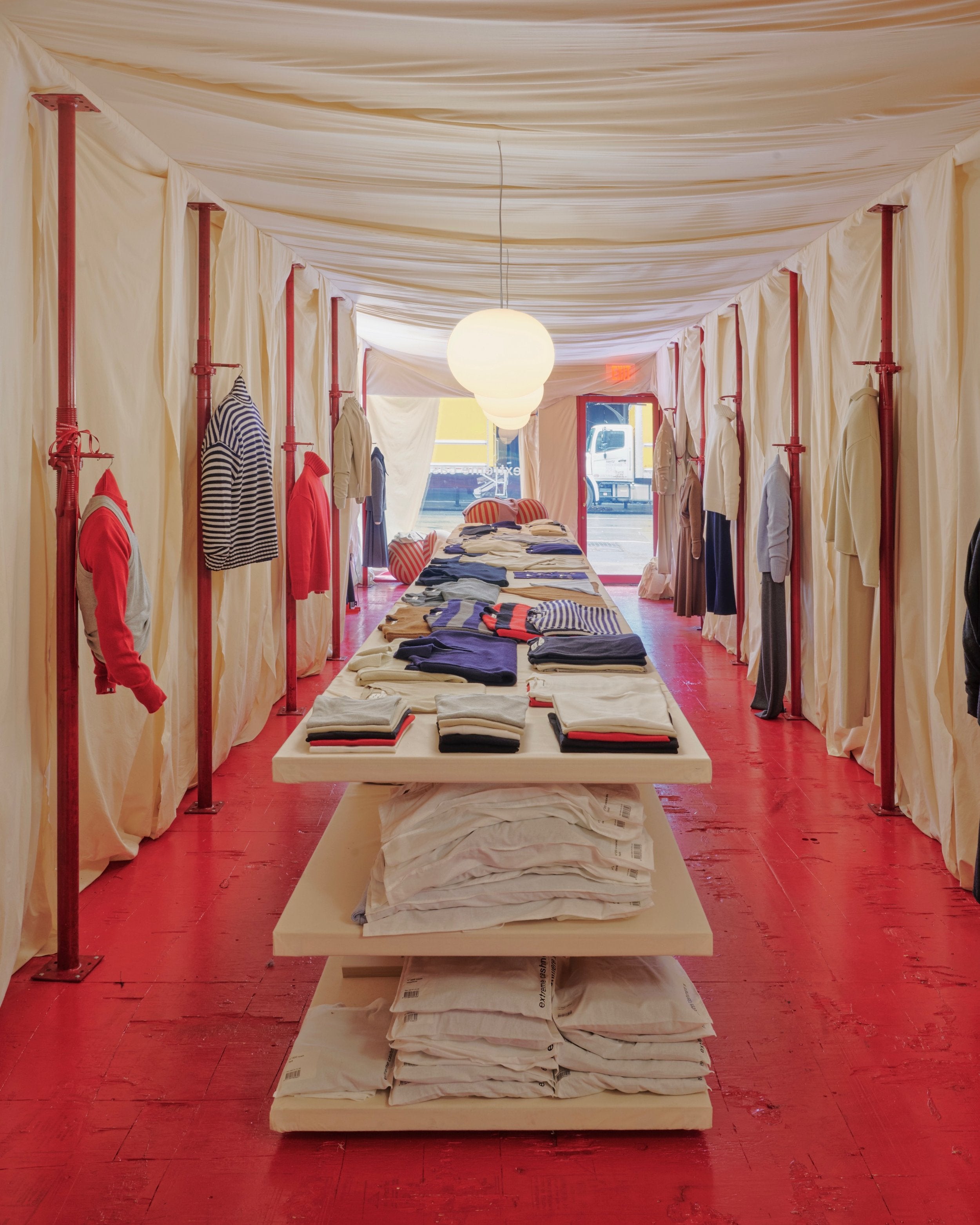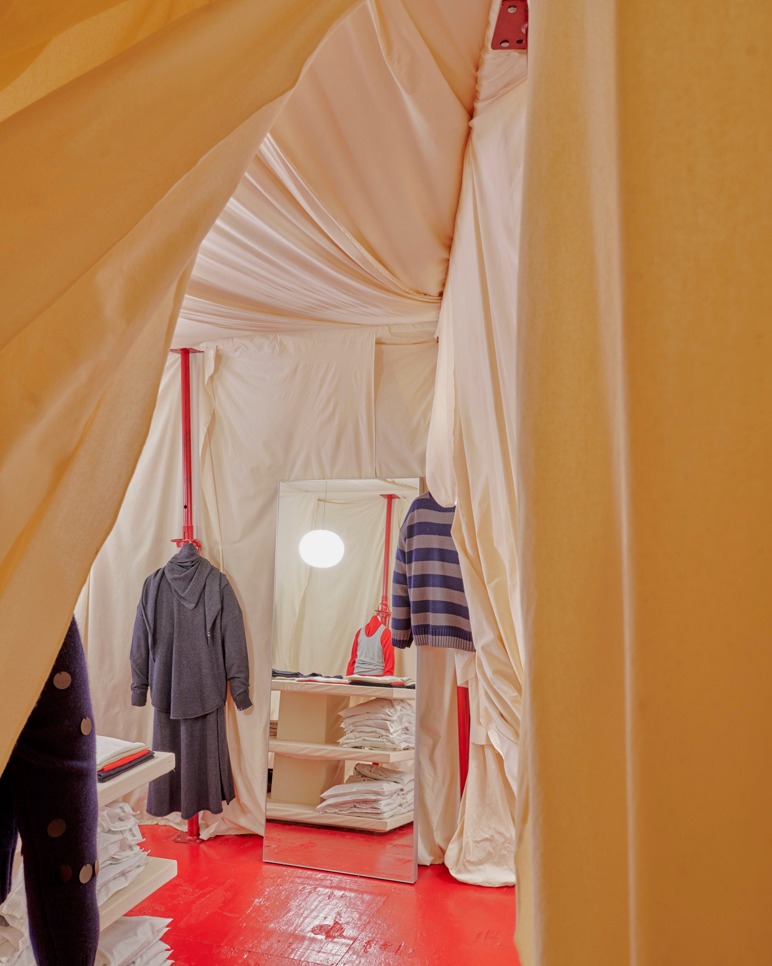 For the launch of their pop-up on Madison Avenue in New York City, Studio UKU flew over for two weeks to bring the project to life. The space is entirely lined with muslin cotton, creating the feeling of stepping into a fabric tunnel.