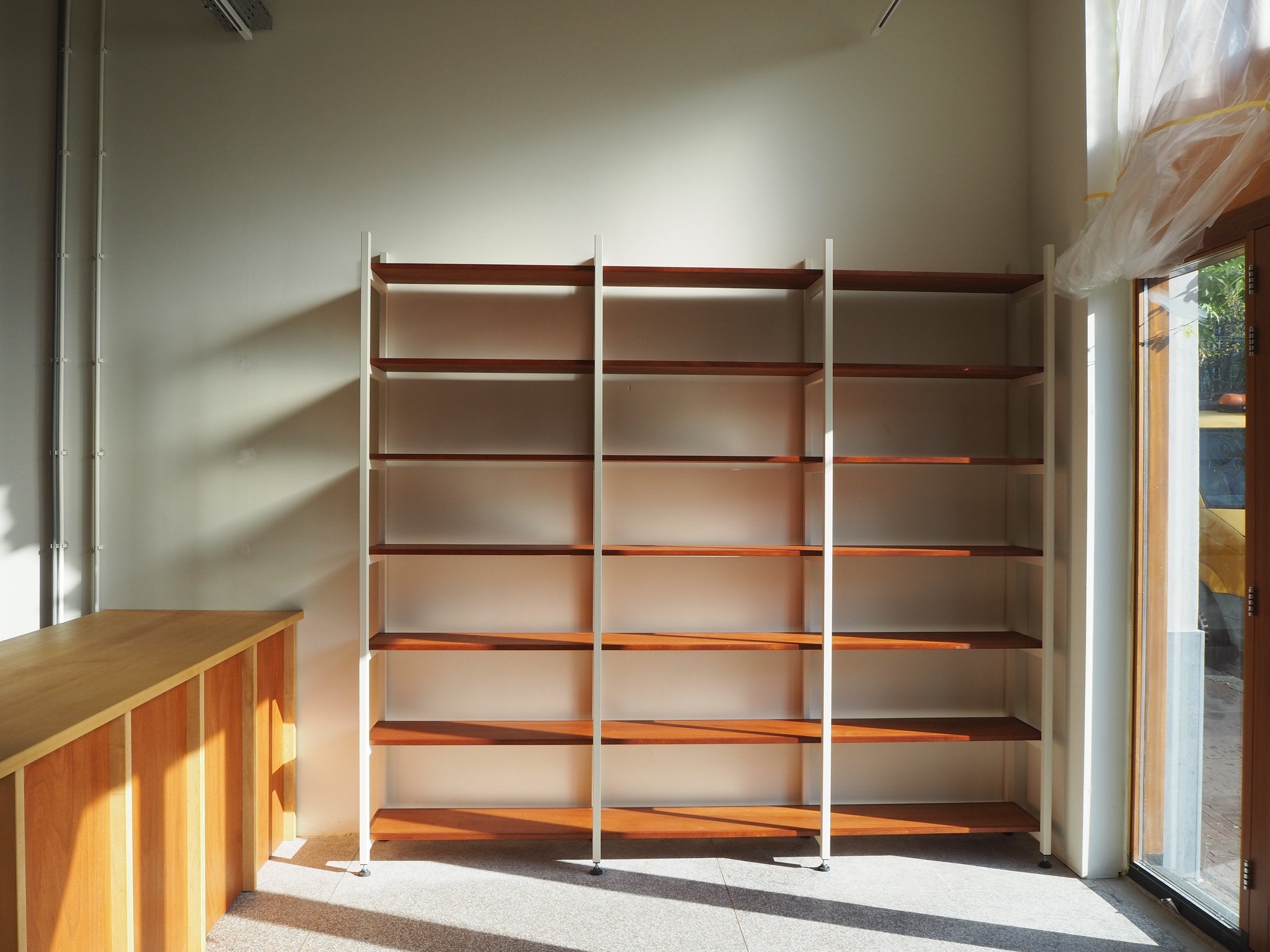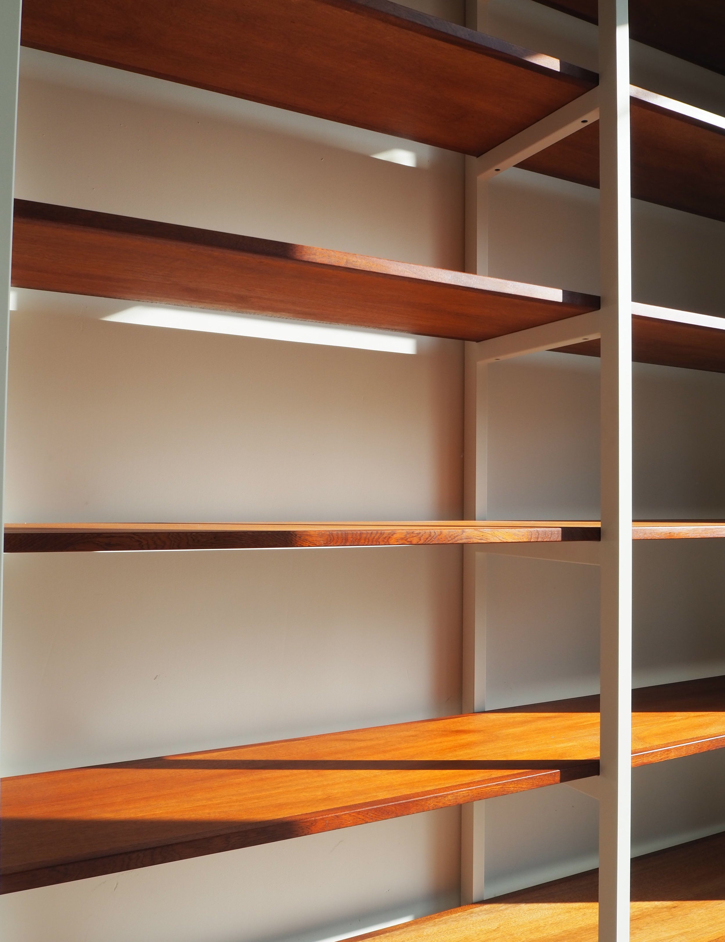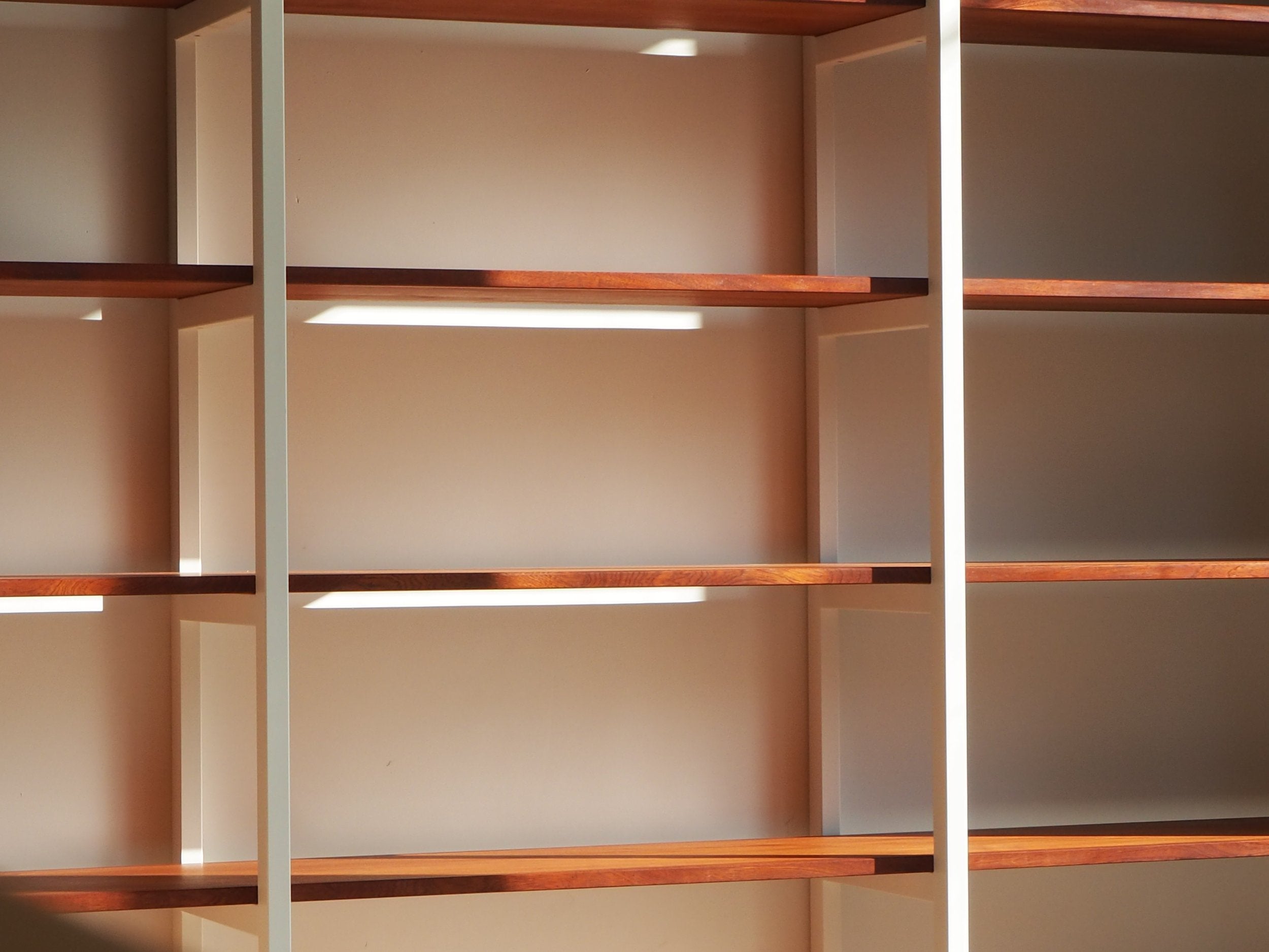 For the first Louf location, situated next to restaurant Binnenvisser on Bilderdijkstraat in Amsterdam, we designed a floor-to-ceiling shelving unit. With the ceiling reaching an impressive four and a half meters, we opted for steel supports. The shelves are made from plywood, edged with solid hardwood strips.